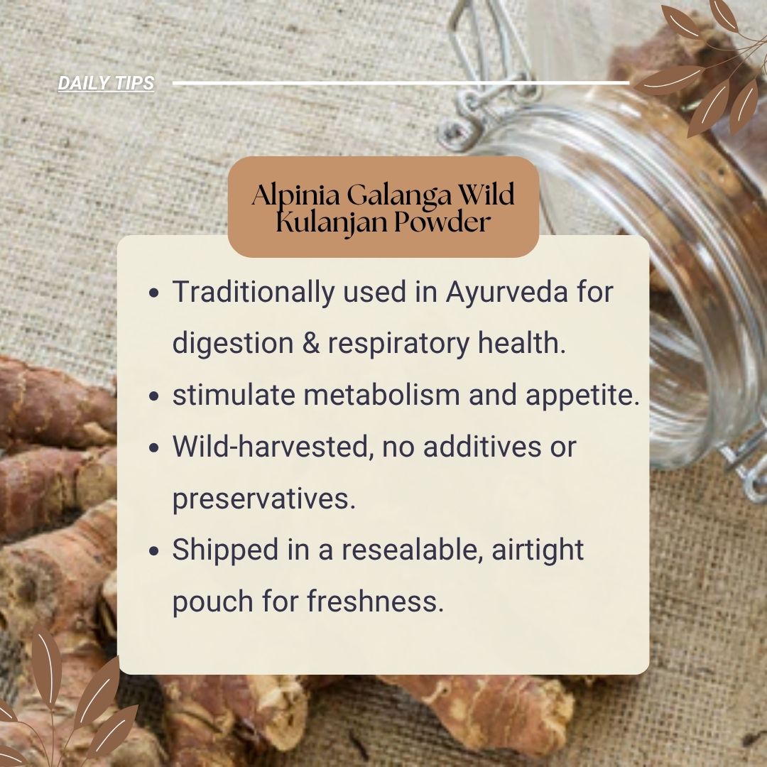 Discover the powerful benefits of Koshtha Kulinjan Powder, also known as Alpinia Galanga, Kulanjan, or Paan Jadd. Sourced from wild-grown roots, this traditional Ayurvedic herb is revered for its digestive and respiratory support properties. Often used in herbal formulations and home remedies, it may help promote appetite, relieve bloating, and support natural immunity.