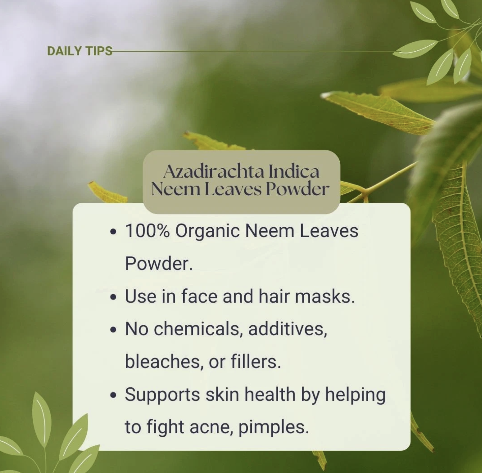 - 100% Organic Neem Leaves Powder: Made from pure neem leaves, ideal for hair, skin, and as a dietary supplement.